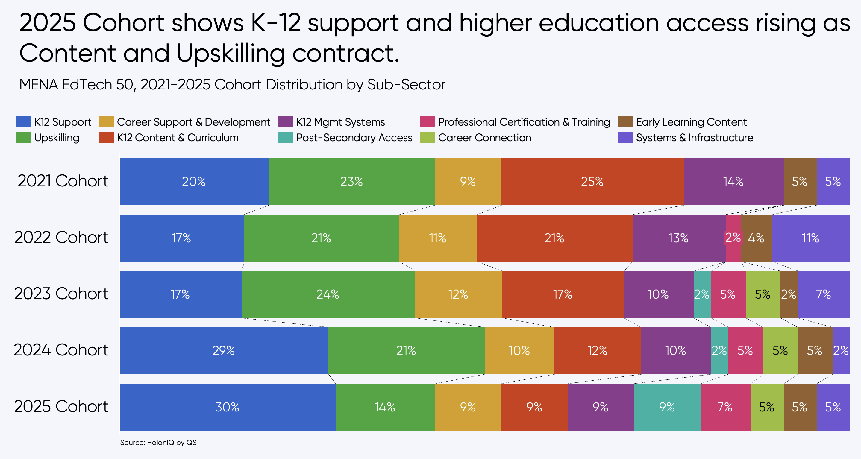 K-12 education leads the 2025 cohort with a marked emphasis on support and classroom solutions. In 2025, K-12 companies make up 44% of the cohort, reflecting sustained investor and policy attention on schooling and learner-facing products across the region. While K-12 support and content remain prominent, with notable returning startups such as Abwaab, and startups focused on engagement gained investor attention (Ultimate Learning Academy ). There is meaningful growth in post-secondary access solutions (20% of the list) as startups race to remove barriers into higher education. Workforce-focused companies remain an important segment taking nearly a third of the cohort, but the composition within that sector has shifted: upskilling now accounts for a smaller share, while career services and employer-facing match and placement products have expanded. The result is a cohort where classroom modernization and access-focused post-secondary plays coexist with a newer generation of career and placement platforms.